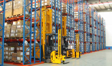 此類倉庫中,低、高位倉庫大多用前移式電瓶叉車、平衡重電瓶叉車、三向叉車進行存取作業(yè),貨架較矮時也可用電動堆高機,超高位倉庫用堆垛機進行存取作